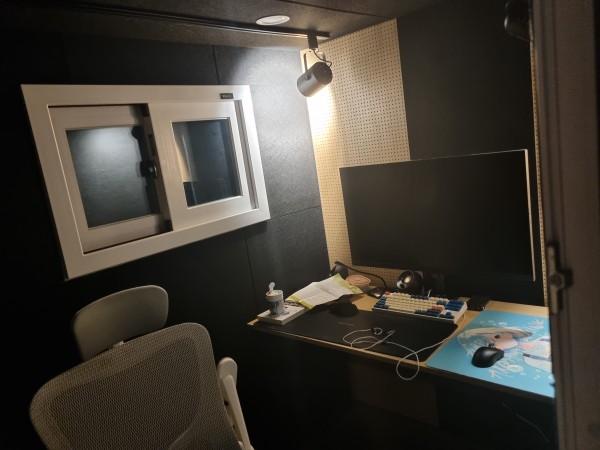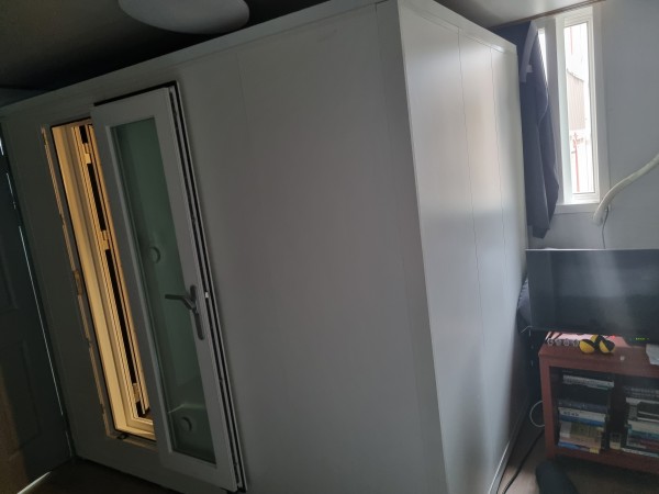 방음부스 특성상 여름에 뭐 하려면 너무 더워서 에어컨을 설치하였습니다. 에어컨은 별도로 구매하셔서 설치요청 하시면 설치 가능합니다. 저는 당근에서 10만원짜리 벽걸이 에어컨 사서 달았는데 그방에 에어컨이 필요할거같아서 에어컨 미포함 가격입니다.